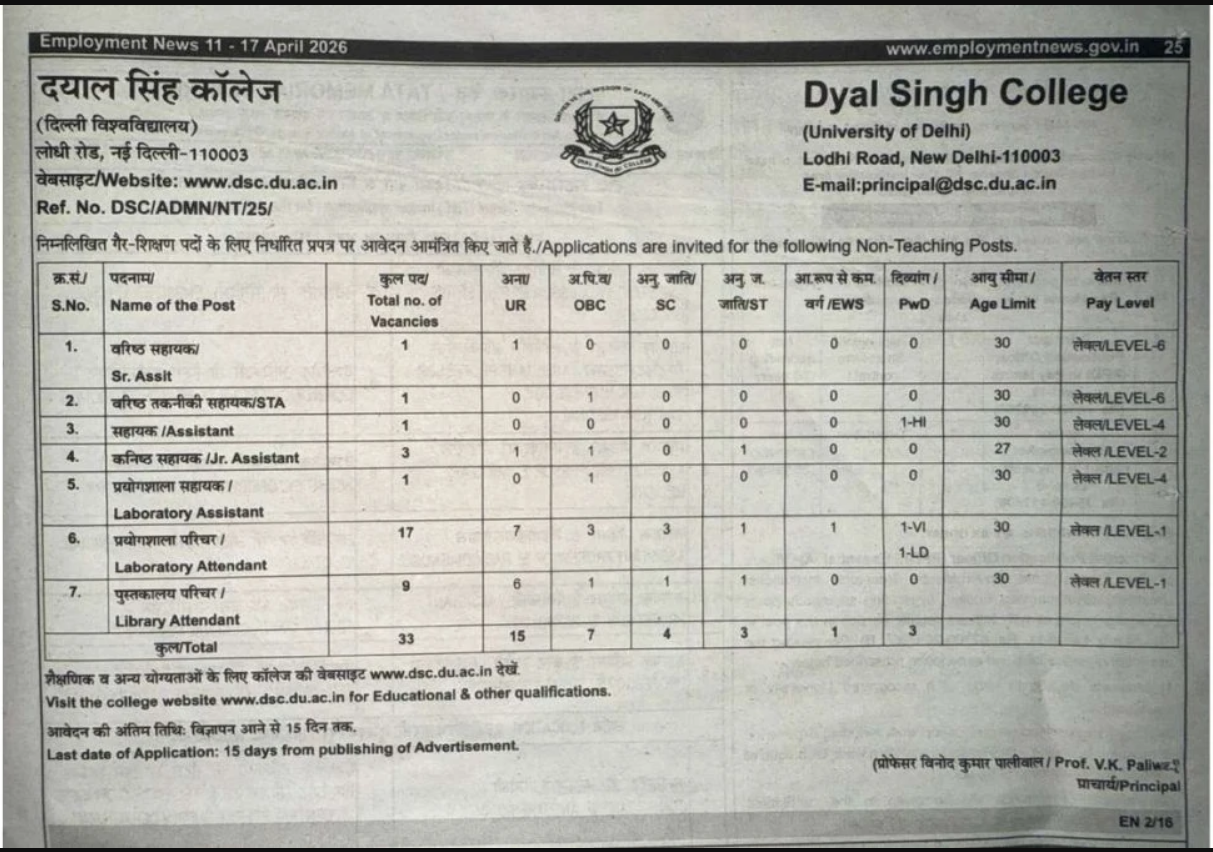 Dayal Singh College Delhi has released the official notification for the recruitment of 33 Non-Teaching Posts for the year 2026. This is a excellent opportunity for candidates seeking stable government employment in the education sector. The application process is conducted in offline mode. Candidates interested in these Latest Govt Jobs 2026 must ensure they meet the eligibility criteria before submitting their forms.