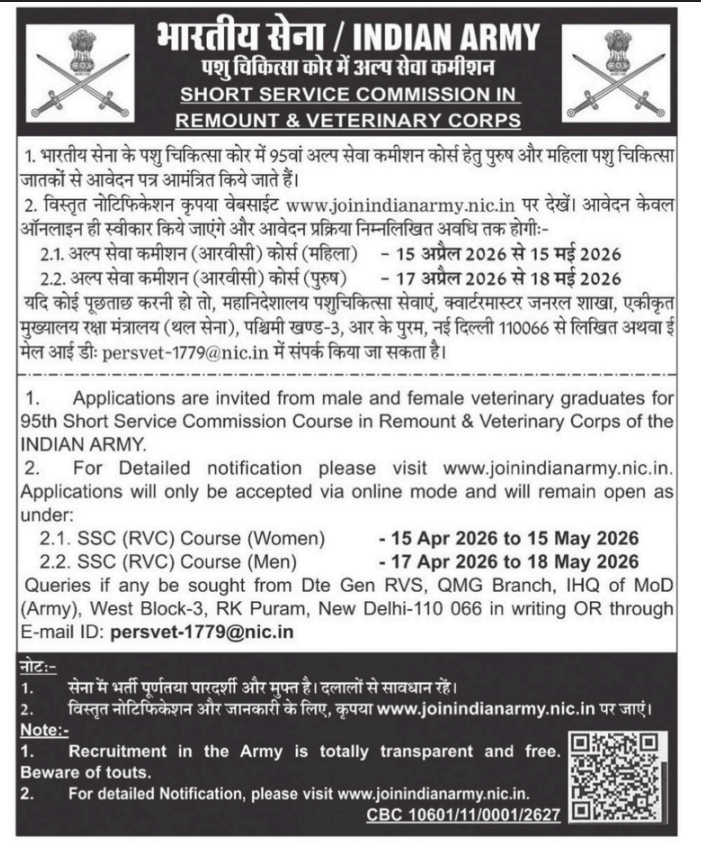 The Indian Army has released a recruitment notification for the 95th Short Service Commission (SSC) Remount Veterinary Corps (RVC). This is a prestigious opportunity for veterinary graduates to serve the nation. Candidates looking for the Latest Govt Jobs 2026 can apply online through the official Indian Army portal.