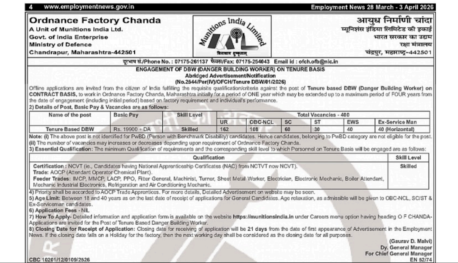 Ordnance Factory Chanda (OFC), a unit of Munitions India Limited under the Ministry of Defence, has issued Advertisement No. 2544/Per(IV)/OFCH/Tenure DBW/01/2026 for 400 Tenure Based Danger Building Worker (DBW) posts on a contract basis. Applications are to be submitted offline within 21 days of 28 March 2026 (approximately by 17 April 2026).